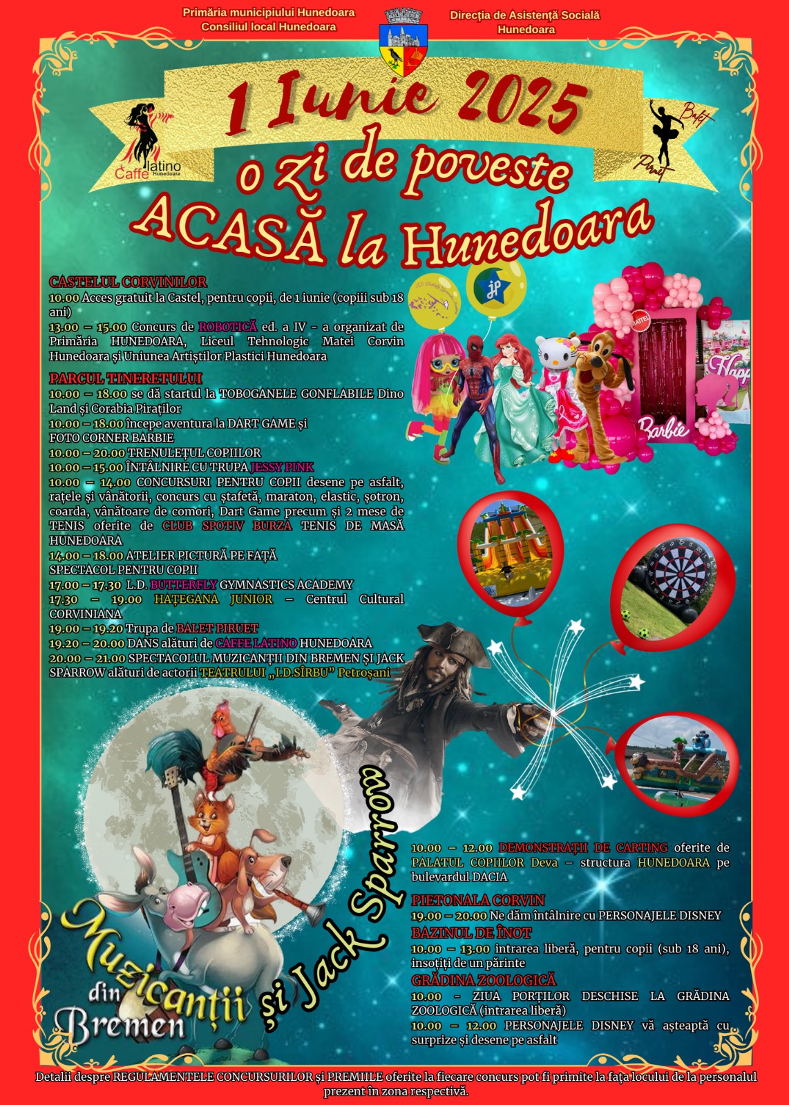 Ziua de 1 iunie va fi una absolut fermecătoare, în municipiul Hunedoara County! Demonstrații de carting, tobogane gonflabile, jocuri, concursuri, ateliere, spectacole pentru copii, personaje din lumea Disney, concurs de robotică și multe alte activități sunt pregătite pentru a transforma ziua de 1 iunie într-una de poveste.