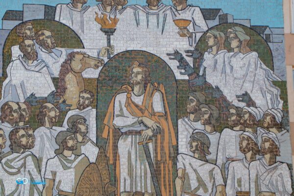 Placajul ceramic este de mari dimensiuni și îl înfățișează pe regele geto-dacilor, Burebista, în mijlocul supușilor săi care îl privesc cu admirație. Lucrarea măsoară 130 de metri pătrați și ocupă întreaga fațadă a unui bloc, cu patru etaje, din Orăștie. Este vorba despre blocul situat pe Strada Armatei, numărul 2, unul din primele blocuri construite în oraș.